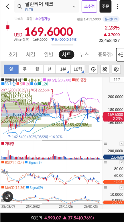 첨부된 차트를 살펴보면 현재 팔란티어의 주가는 볼린저 밴드 중심선 부근에서 치열한 공방을 벌이고 있습니다. 최근 고점이었던 207달러선에서 조정을 받은 이후, 160달러 초반에서 강력한 지지선을 형성하며 반등을 시도하는 모습입니다.