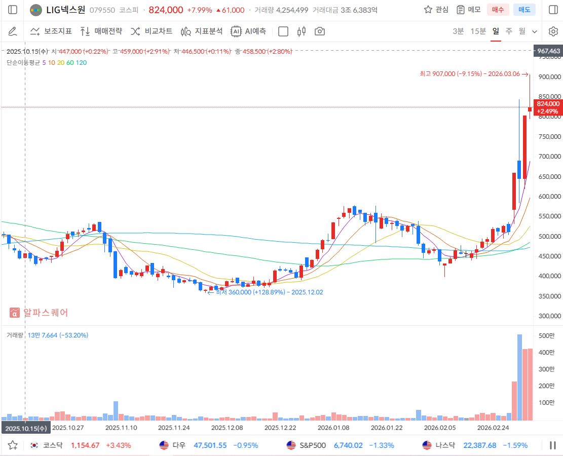 LIG넥스원은 3월 6일 장 초반, 중동 전쟁 확산 우려와 '천궁-II'의 실전 요격 성공 소식에 13% 이상 급등하며 907,000원이라는 신고가를 찍었습니다. 하지만 장 후반 코스피 급락의 여파를 이기지 못하고 상승분을 대부분 반납하며 마감했습니다.