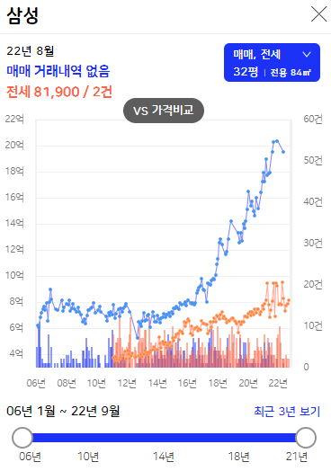 삼성아파트 국평 물건은 2007년 9억대 초반까지 올랐으나 2012년 5억대까지 하락했다. 약 45% 하락한 것으로 반토막이 났다고 볼 수도 있을 정도다. 전고점을 회복한 것은 2016년 전후로 이후 부동산 상승기를 맞아 20억대까지 상승했다. 전 고점대비 2배 넘게 오른 것이며, 최저점과 비교하면 약 4배 정도 올랐다고 할 수 있다. (신이 나에게만 최저점을 알려준다면!)