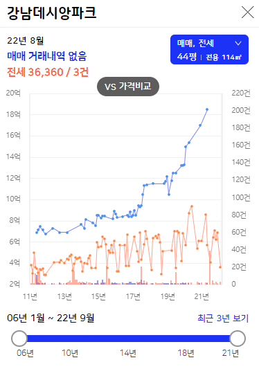 세곡동 강남데시앙파크는 다른 단지들처럼 2011년에 입주해 그 전 고점을 확인하기 어렵다. 2011년을 기점으로 했을 때 44평형이 2011년 7억대에 팔렸으나 2012년부터 2013년까지는 6억대로 하락했다. 이후 계속 상승해 최근 19억까지 상승했다. 2011년 대비 약 2.5배 정도 상승했다.