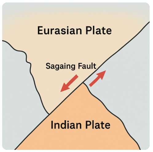 미얀마는 지진의 위험이 항상 존재하는 나라다. 지도에서 보면, 미얀마는 거대한 두 대륙판 — 인도판과 유라시아판 — 이 충돌하는 경계에 위치해 있다. 그 사이에서 형성된 **'사가잉 단층'**은 미얀마를 남북으로 가로지르며 마치 지구의 상처처럼 누워 있다.